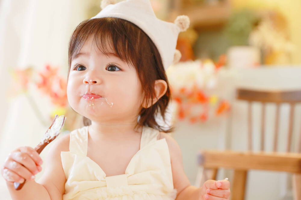 小さな手でスプーンを握りしめ、夢中になって楽しむ姿。
