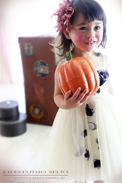 子どもの笑いの自然さと衣装からくる神秘感を表現するために普段より照明を少しだけ強く調節し、思い切ったトリミングで人物の表情を強調しました。