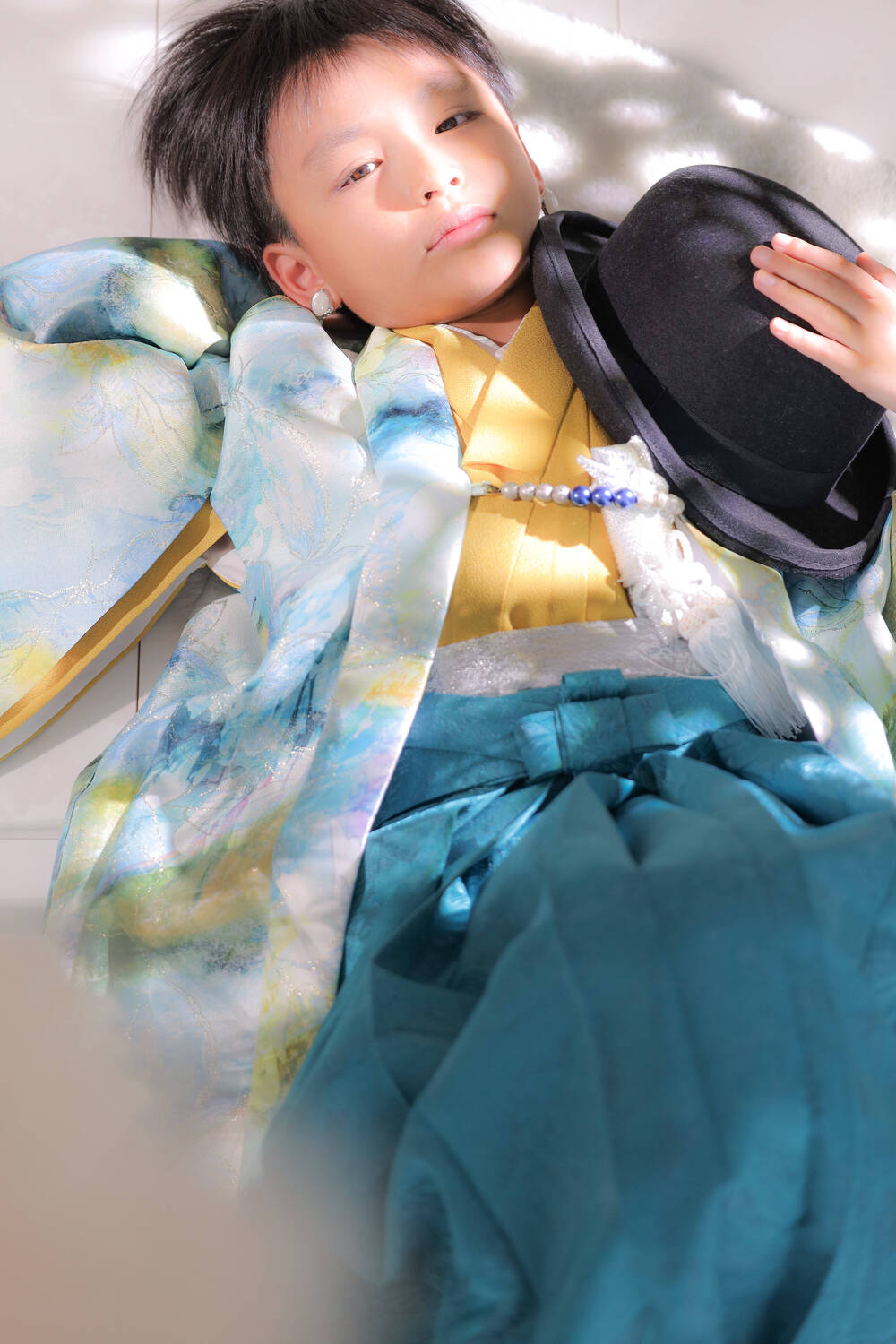 和装に黒のハットを合わせ、光と影を活かした構図で撮ることで、少年らしいかっこよさが引き立っています。