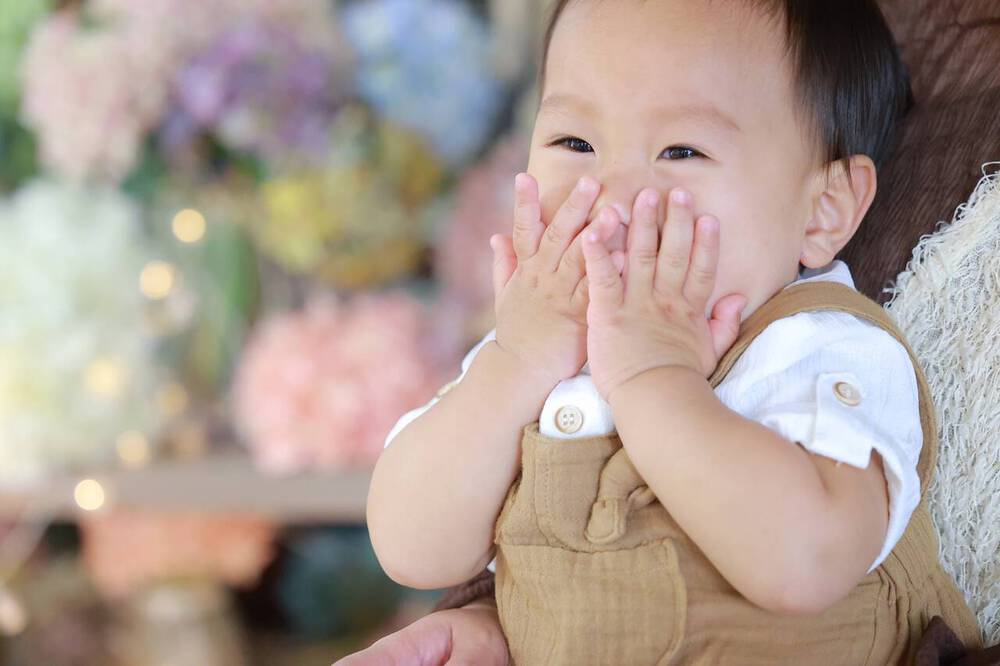 手で顔を隠しながらのくすぐったい笑い。