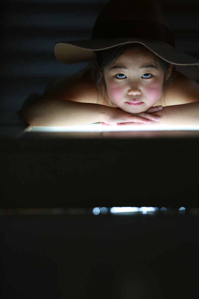 窓から入る自然光の存在感を消す為に、敢えてISOを下げ、アッパーライトに光源を集中させている。1灯という潔さはベストだ。暗闇のような世界の中で、印象的に被写体の存在感を浮かび上がらせ、彼女のその目に全てを託している。