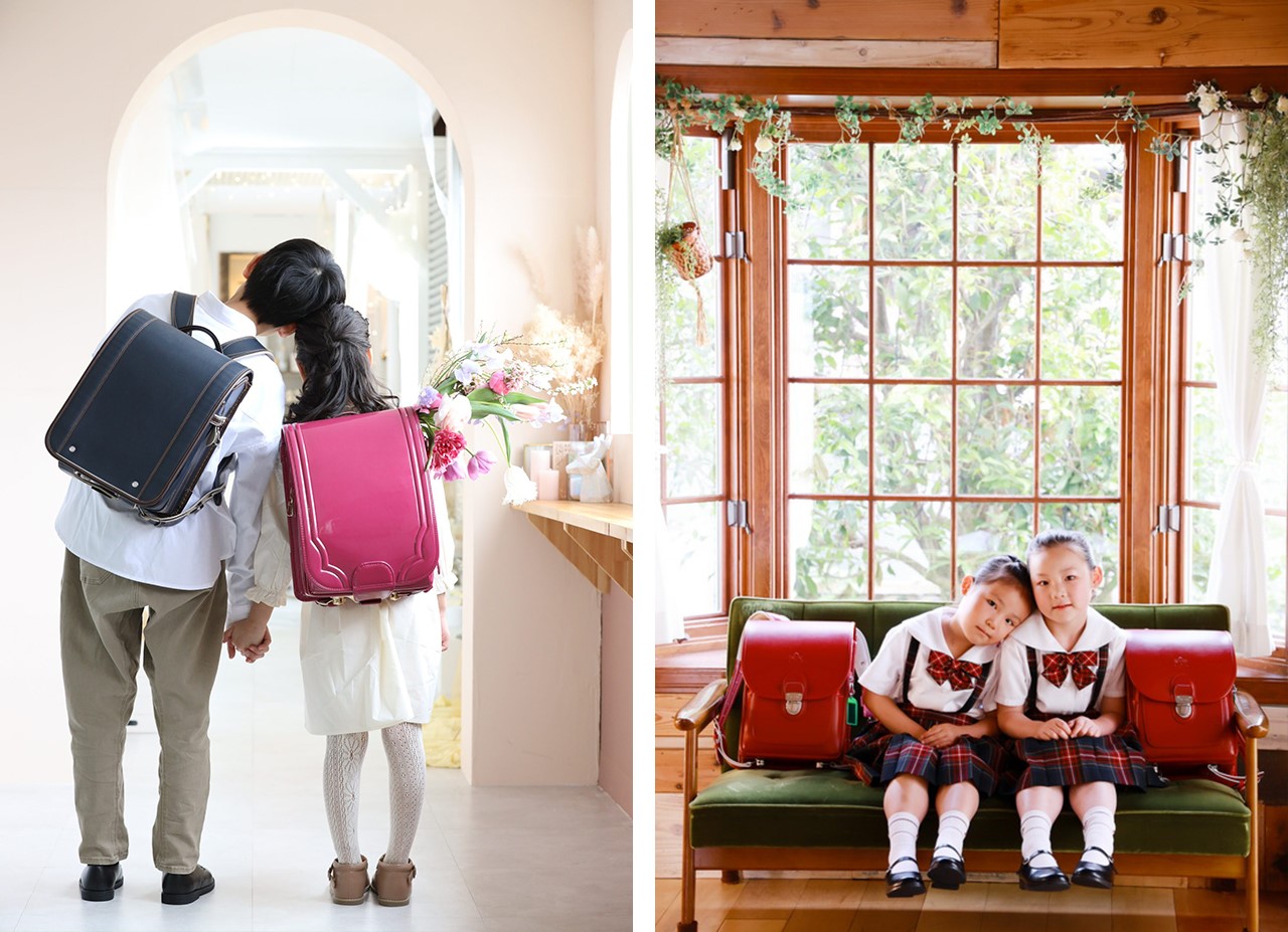 卒園・卒業、入園・入学の撮影では、園服や制服、フォーマルな衣装をお持ち込みいただく方が多くいらっしゃいます。特に入園・入学の撮影では、新しいランドセルや鞄、ピカピカの制服が主役となり、お子さまの初々しい姿を引き立てます。