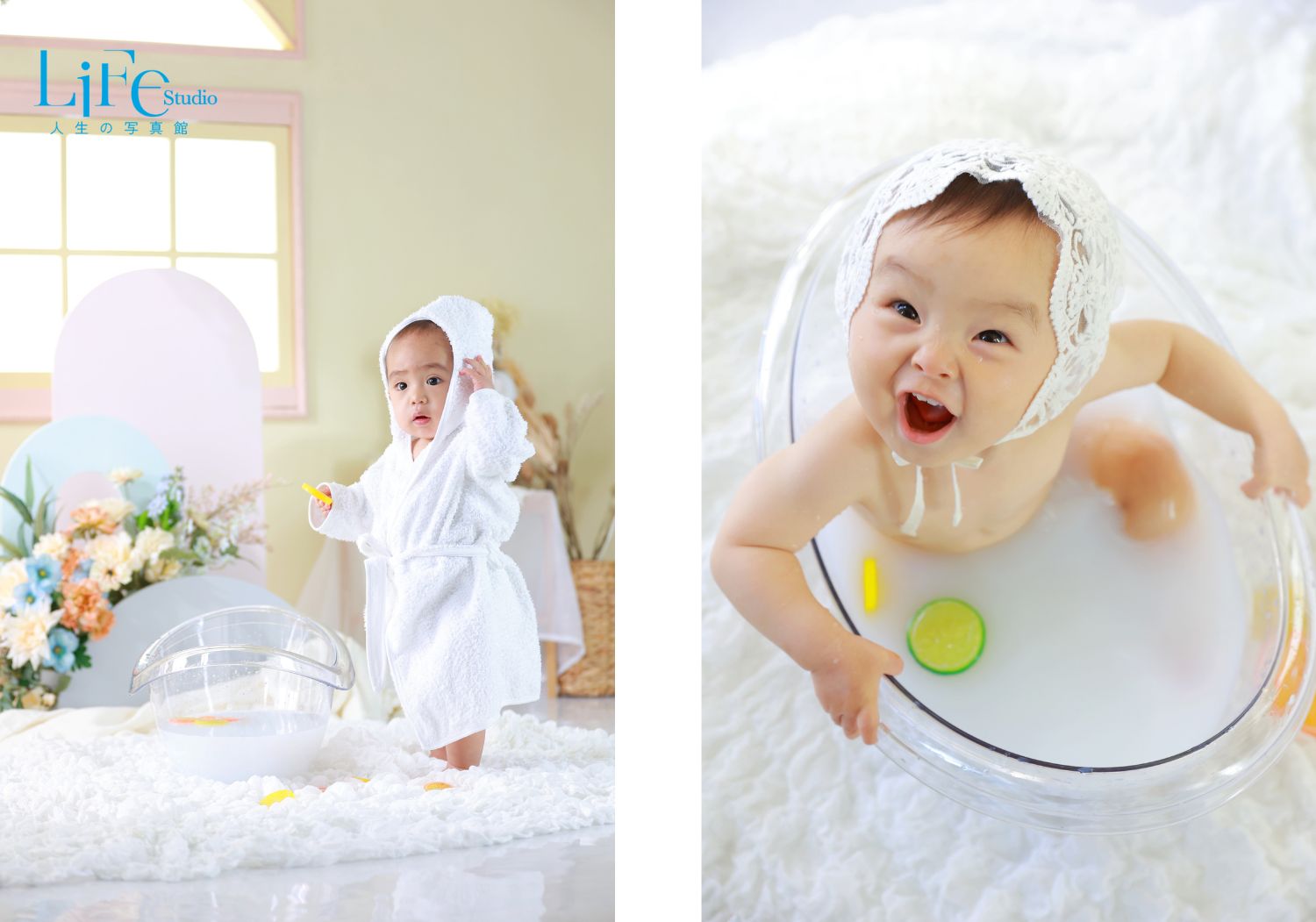 “ケーキ→ミルクバス”のセットで、よりストーリー性のある誕生日フォトに仕上がります。