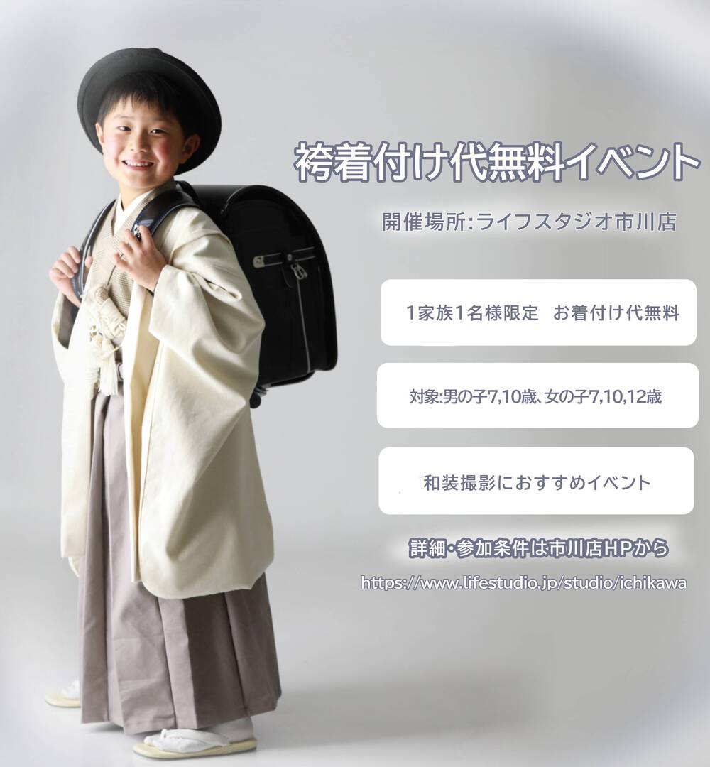 - 【春休み限定】袴お着付け代無料イベント開催!|7歳・10歳(ハーフ成人式)・12歳女の子|7歳・10歳記念日は袴でおしゃれに残そう! 東京から近い千葉・市川・本八幡の人気のフォトスタジオ! ライフスタジオ市川