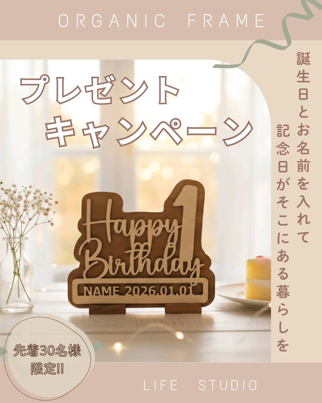 誕生日とお名前を入れてつくる、オリジナルのウッドフレームをプレゼント!