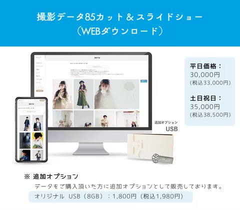 ※ 撮影データ代(85カット+スライドショー/30,000円・税込33,000円)は別途となります。