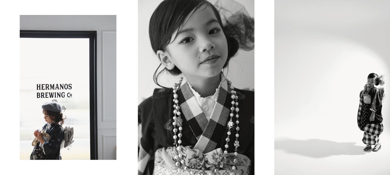 2022年10月にオープンしたばかりの浜松店は、3階建てのスタジオ。クラシックな螺旋階段を登ると、そこにはハイブランドのブティックを思わせるモノトーンの空間が広がります。少し背伸びをして、大人っぽいアイテムを身に着けた子どもたちは、普段とは違った表情を見せてくれるはず。