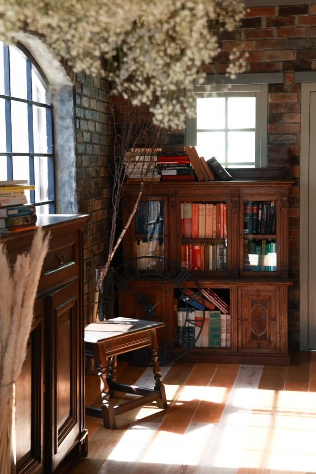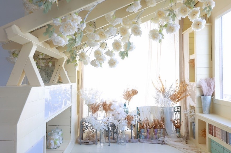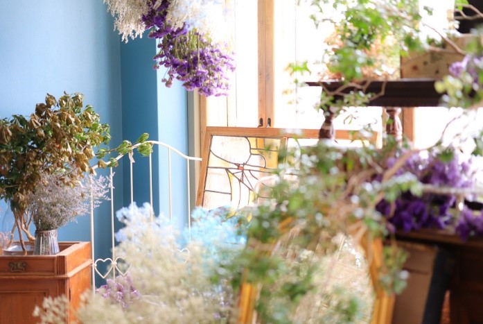 ライフスタジオ京都桂店は、本物のアンティーク家具と生花から手作りのドライフラワーで作ったインテリアがメインとなっています。