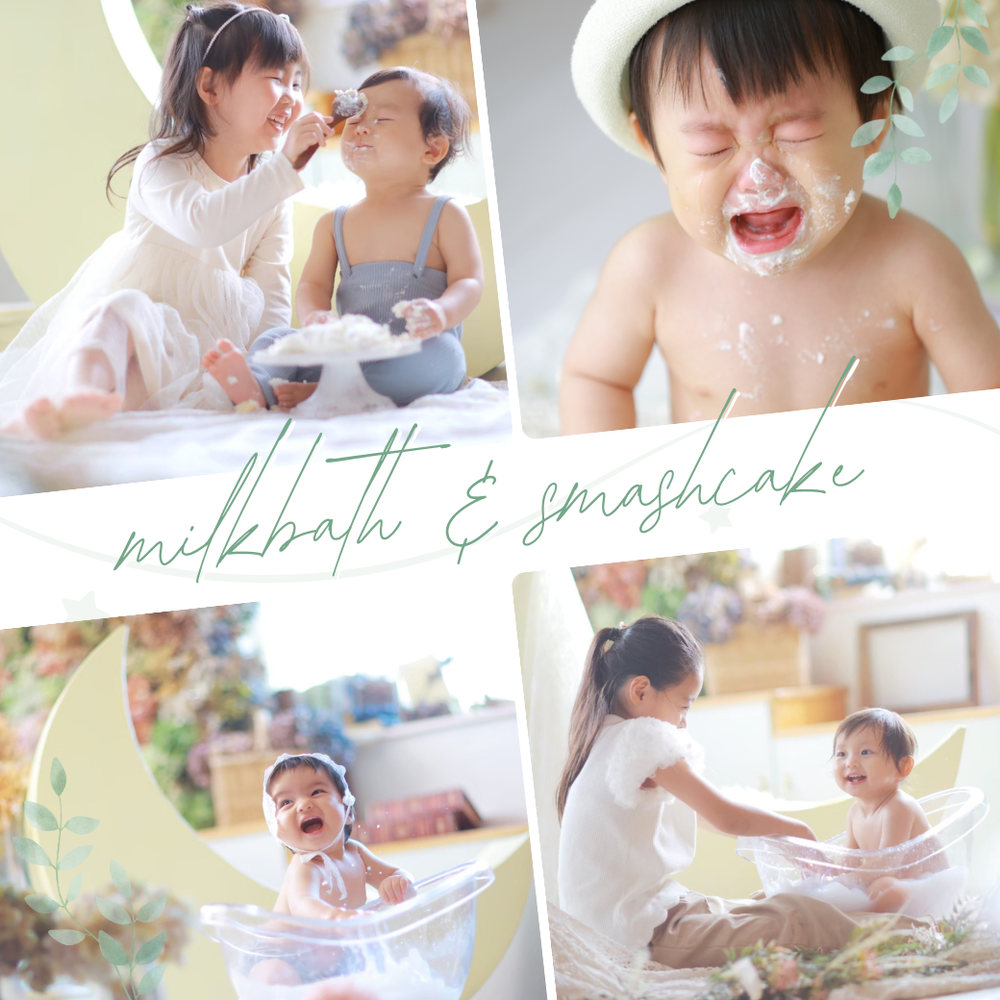誕生日という節目に「少し特別な撮影をしたい」というご家族に選ばれているミルクバス。+3,300円のオプションで体験でき、普段のお風呂時間がアートのような1枚に変わります。赤ちゃんらしい瞬間を優しく、そして特別に残せるプランです。
