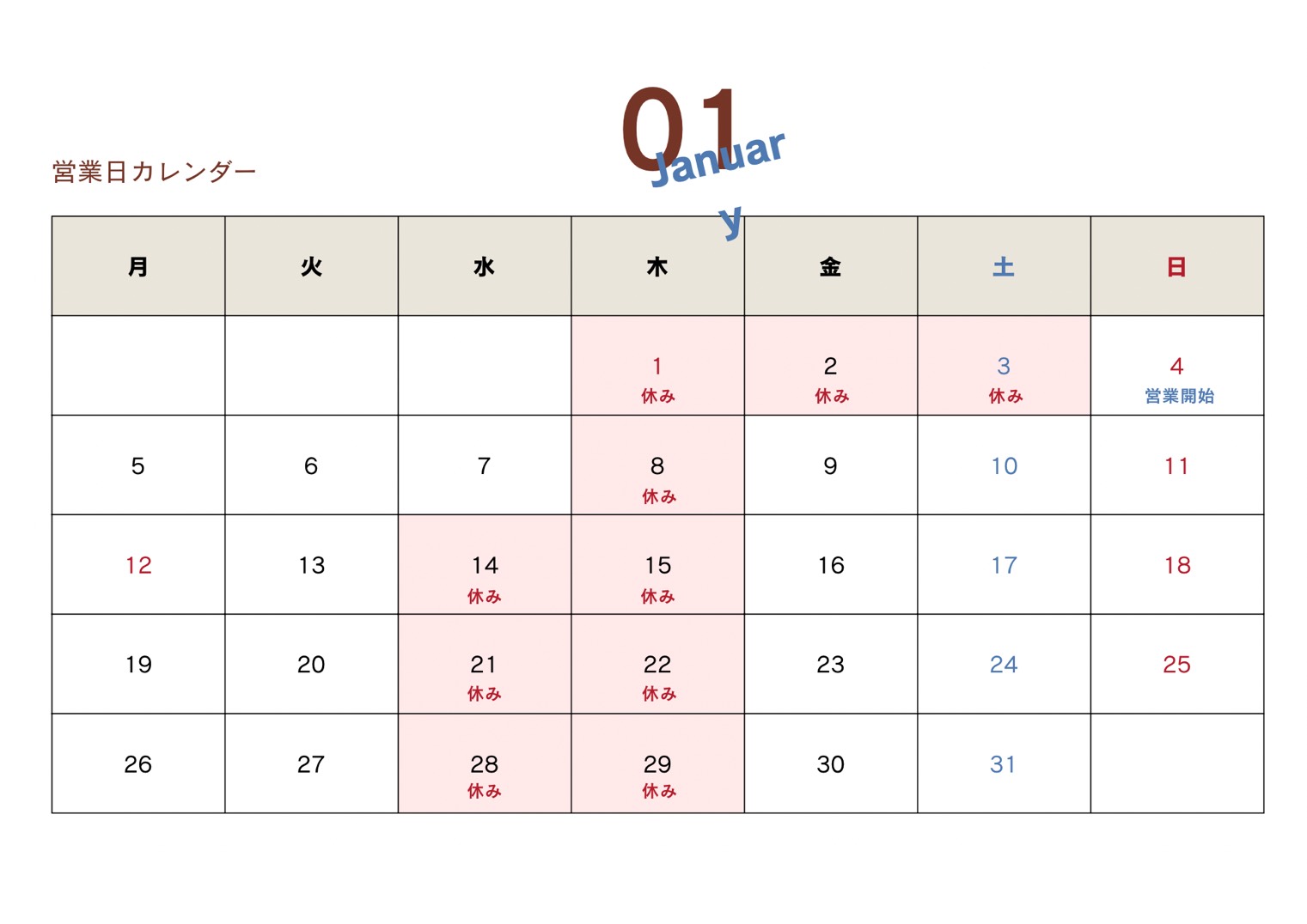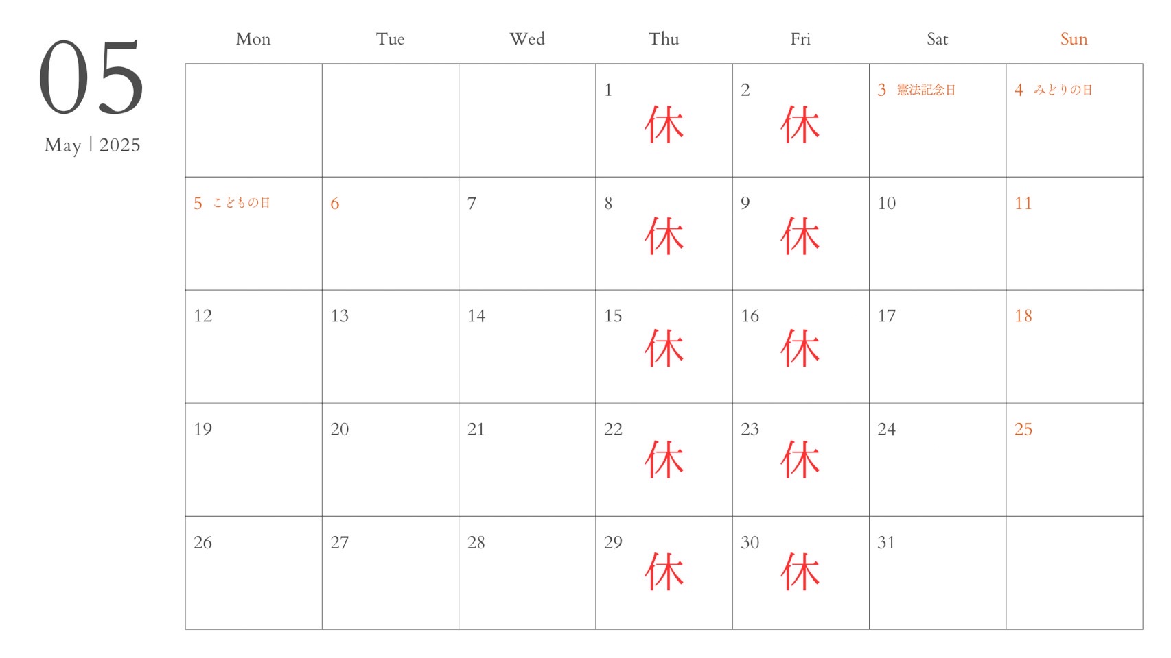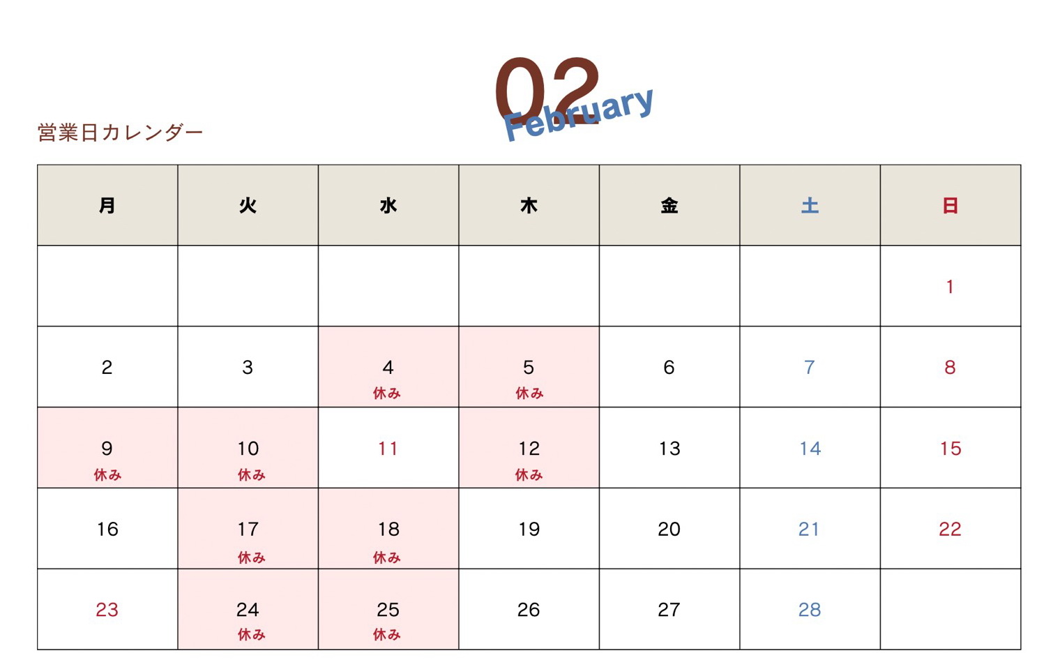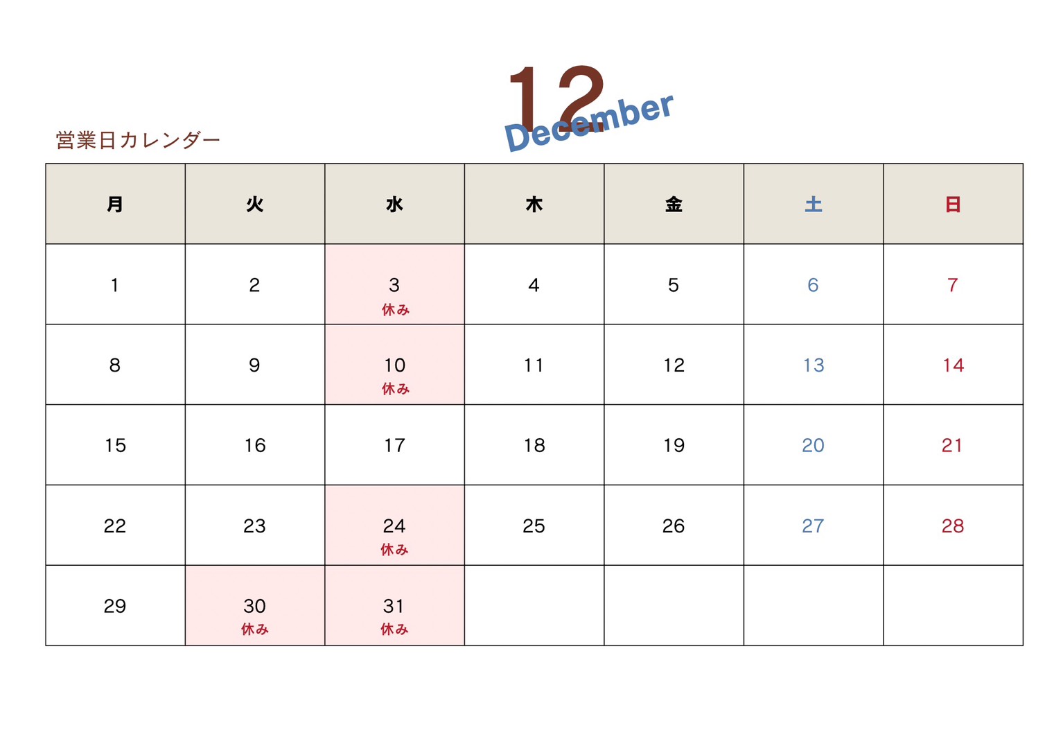 誠に勝手ながら以下のカレンダーの日程はお休みをいただきますため、ご理解の程よろしくお願いいたします。