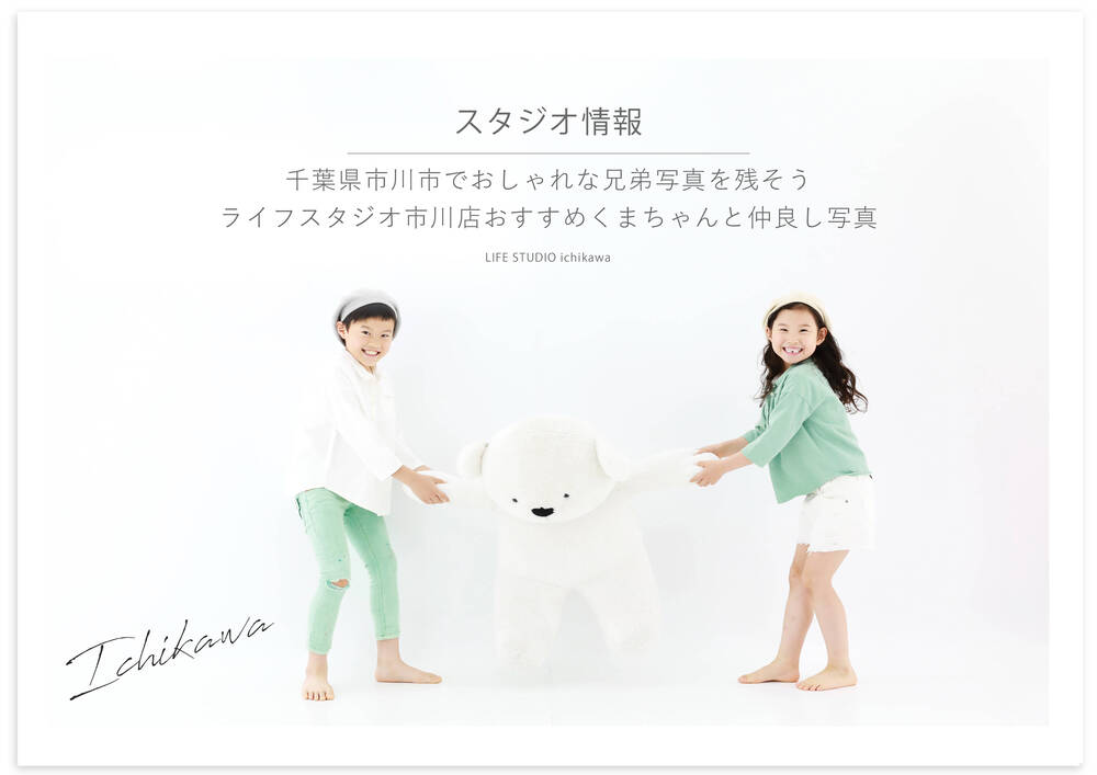 兄弟写真を撮りたくてもお家にいるとなかなか撮れない、そんな声をママさんパパさんから頂くことがあります。2人、3人と人数が増えれば増えるほど、また小さいお子さまがいると上手く撮ることが難しいのが兄弟写真だと思います。せっかくスタジオに来るなら、お家では撮れないかわいくておしゃれな兄弟写真を残したいですよね!今回はライフスタジオ市川店でどのような兄弟写真が撮れるのかご紹介していきたいと思います。市川店で兄弟写真を撮るならくまちゃんと一緒に撮る兄弟写真がおすすめです。実際に市川店で撮影する事が多いくまちゃんとの兄弟写真はライフスタジオならではの写真でありお家では撮れない特別な写真となります。大きなぬいぐるみのくまちゃんとの写真はとてもかわいく、お子さまのかわいさもより一層感じられると思います。