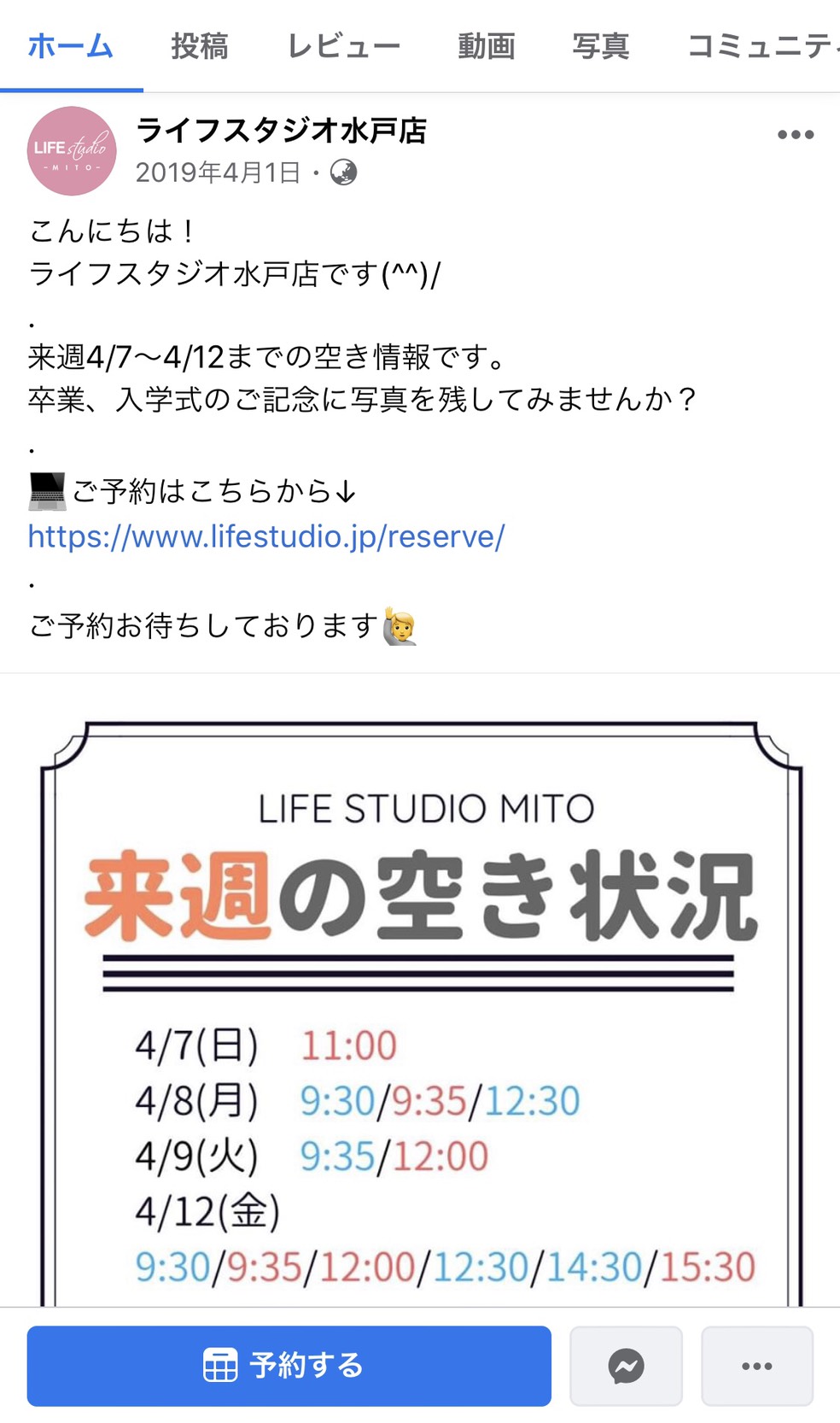 撮影を希望しているお店のFacebookやインスタなどを登録して頂くと上の写真のようにキャンセル待ちがアップされます。たまたまSNSを開いていたときはいち早くキャンセル待ち情報を知ることもできます。