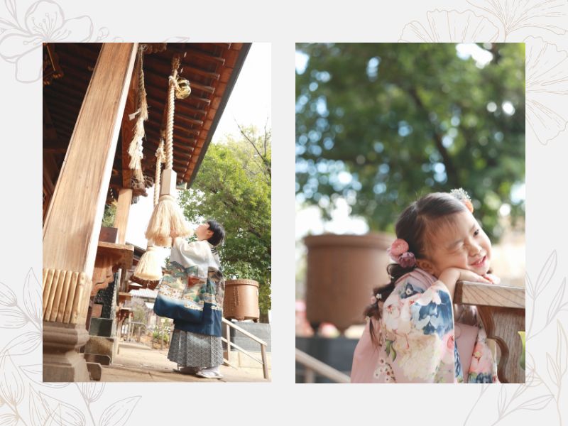 神社ならではの「お賽銭を入れる姿」「お父さん・お母さんと手をつなぐ姿」「ごきょうだいと並ぶ後ろ姿」など、お子さまらしい動きのある瞬間を切り取ることができます。