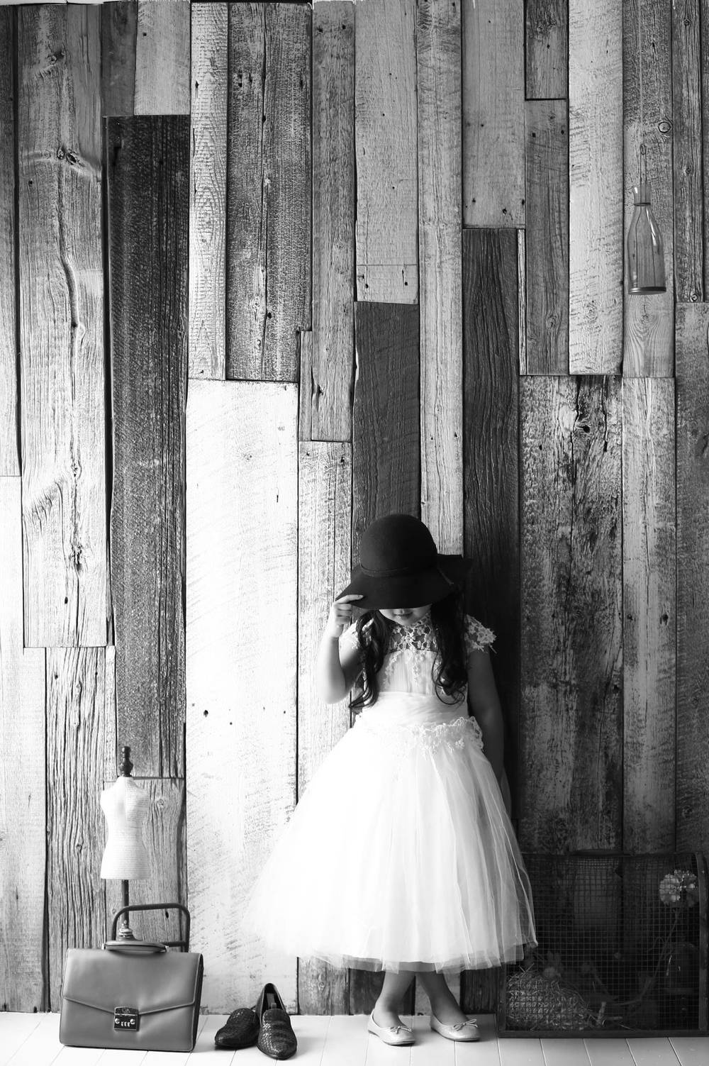 そして背景は可憐なドレスとは一見真反対の印象を感じる板がたくさん貼られた壁。