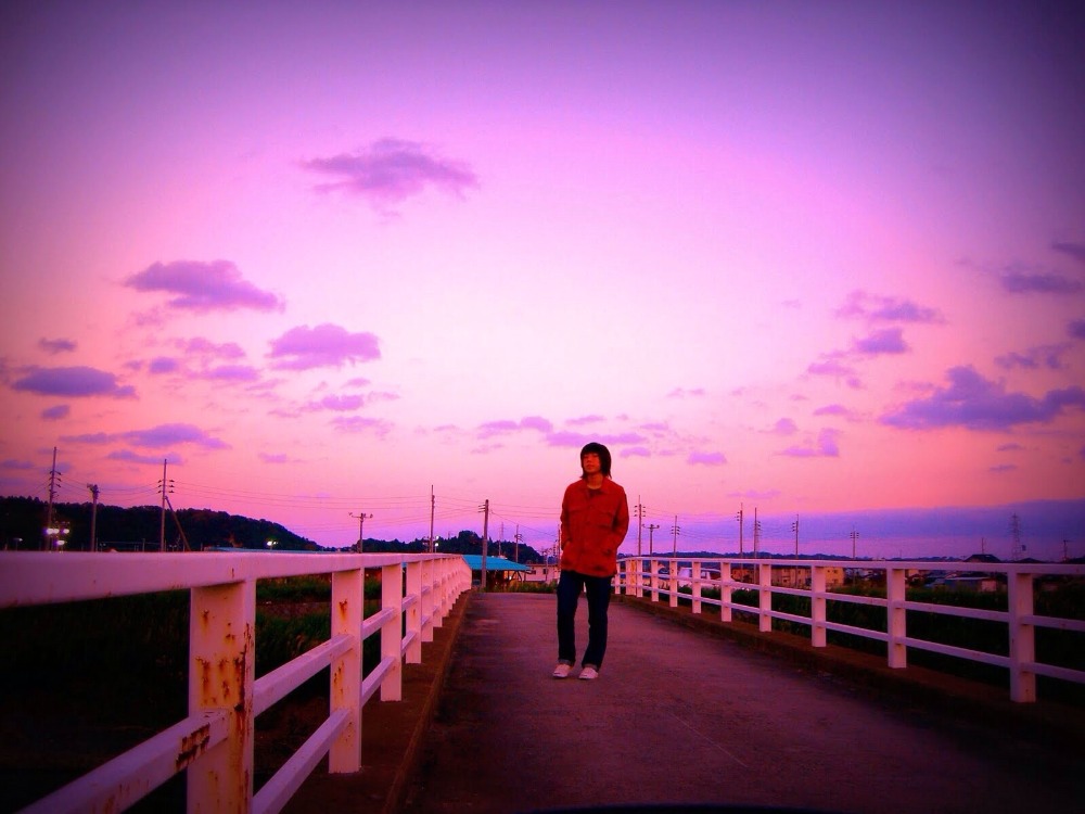 土手に架けられた橋の上で、夕焼けを背にしての一枚。