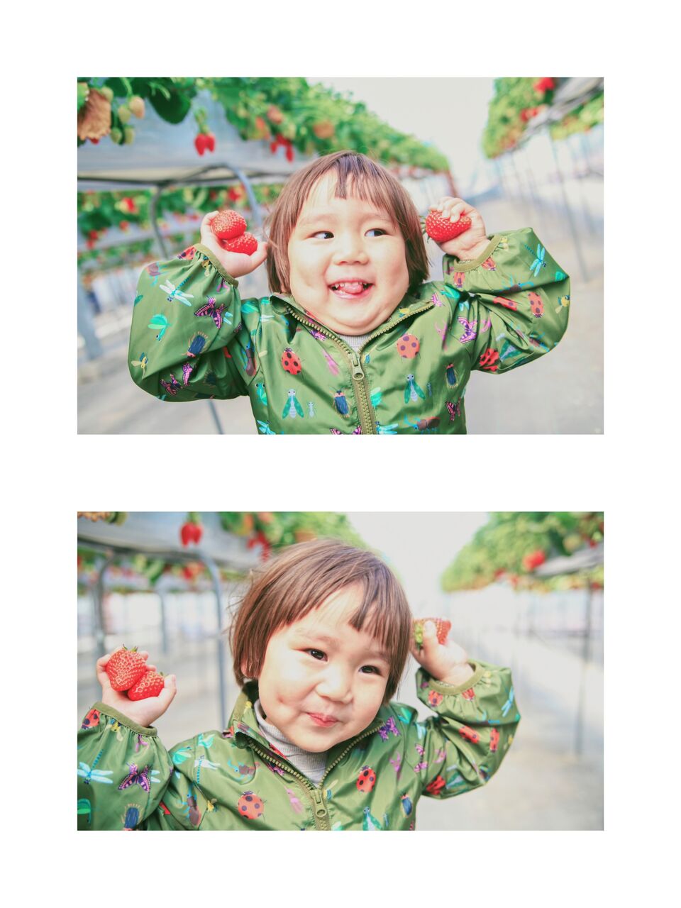 さらにもぎって食べてみて、とってもご満悦のまる。今までまともにいちごを食べたことがありませんでしたが、パクパクとおいしそうに食べるたべる!