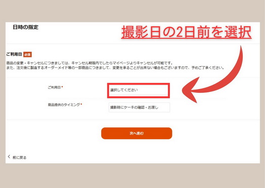 ②撮影日の2日前にスタジオに届くようにCake.jpの店舗専用注文ページより、ご注文/ご購入をお願い致します。