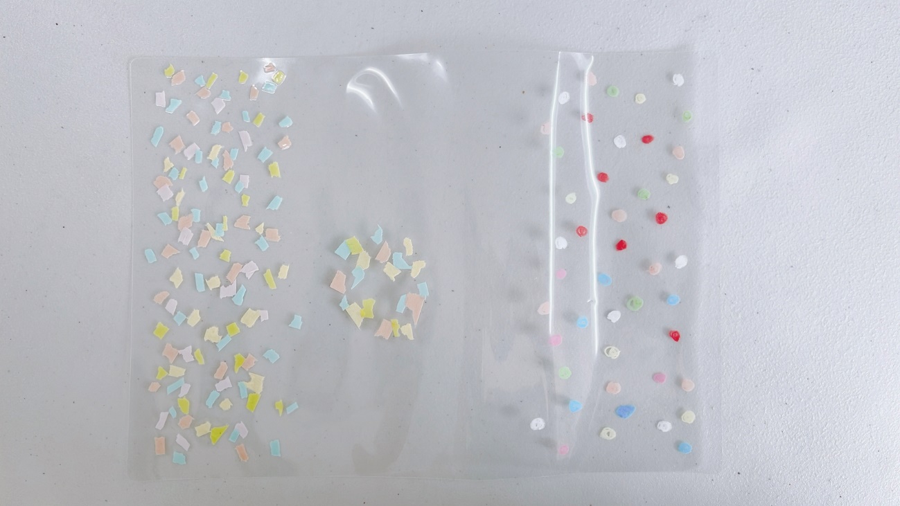 被写体の周りの空間を埋めるようにいれられている前ボケは、細かくちぎったマスキングテープをラミネートしたものが使われています。マスキングの部分はドット柄になり、ラミネート部分は紗がかかったような状態になり、うっすら白みがかってやわらかい効果を狙っています。