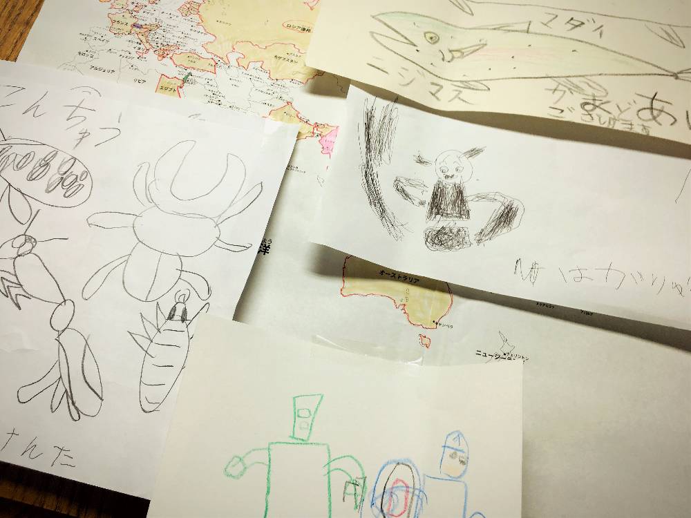 好きな魚、辞典も持っている妖怪たちなど様々な絵たちを私たちはスタッフルームに宝物として飾っておりますw