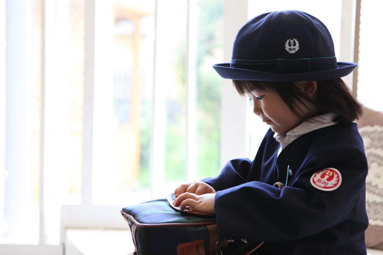 入園のお洋服を着てカバンを見つめています^^ これからの幼稚園生活よろしくね~~^^