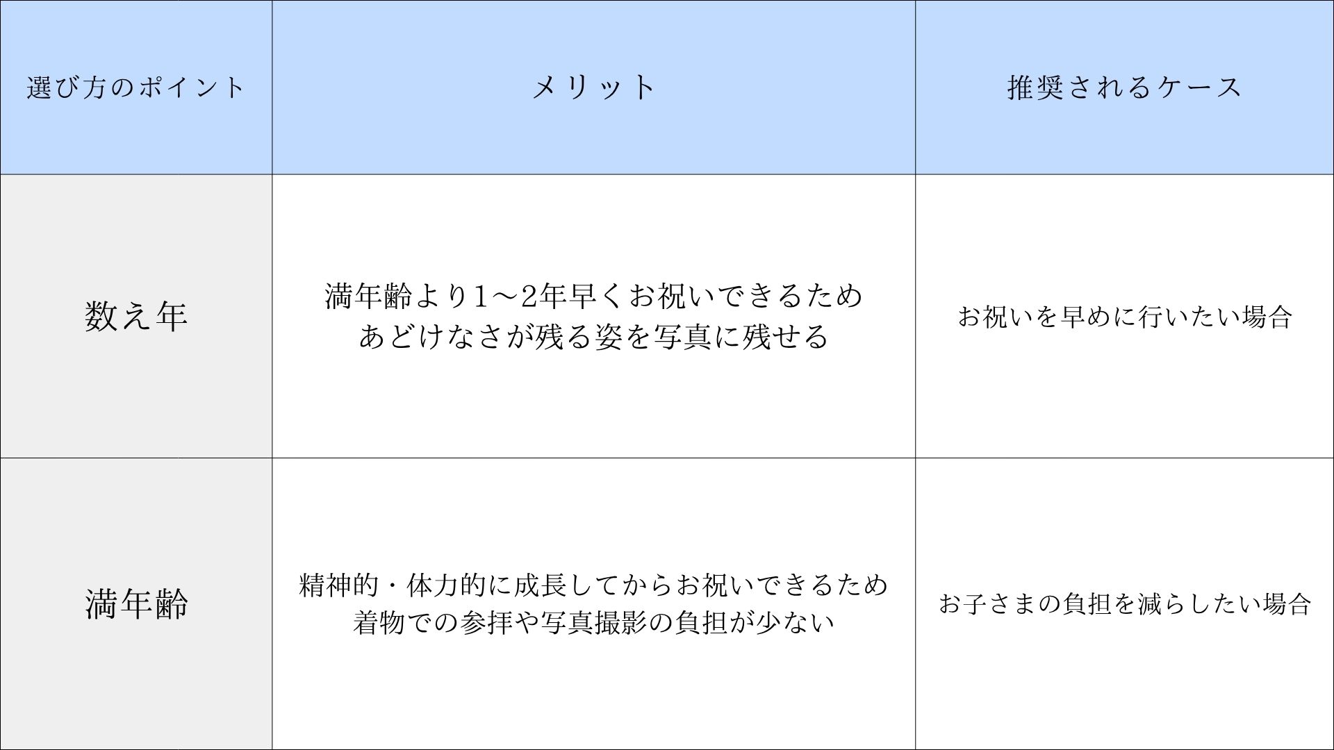 早生まれのお子さまの場合、数え年と満年齢での年齢差が特に大きくなるため迷いやすいですが、上記のように「成長」を軸に判断することをおすすめします。
