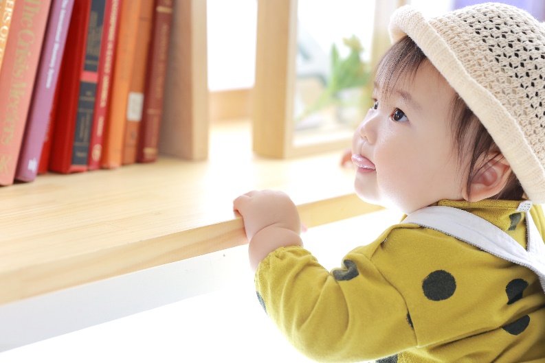 棚に並ぶたくさんの本やビンに興味深々。棚から本を取り出したかと思えば別の所が気になってあちこち冒険へ!