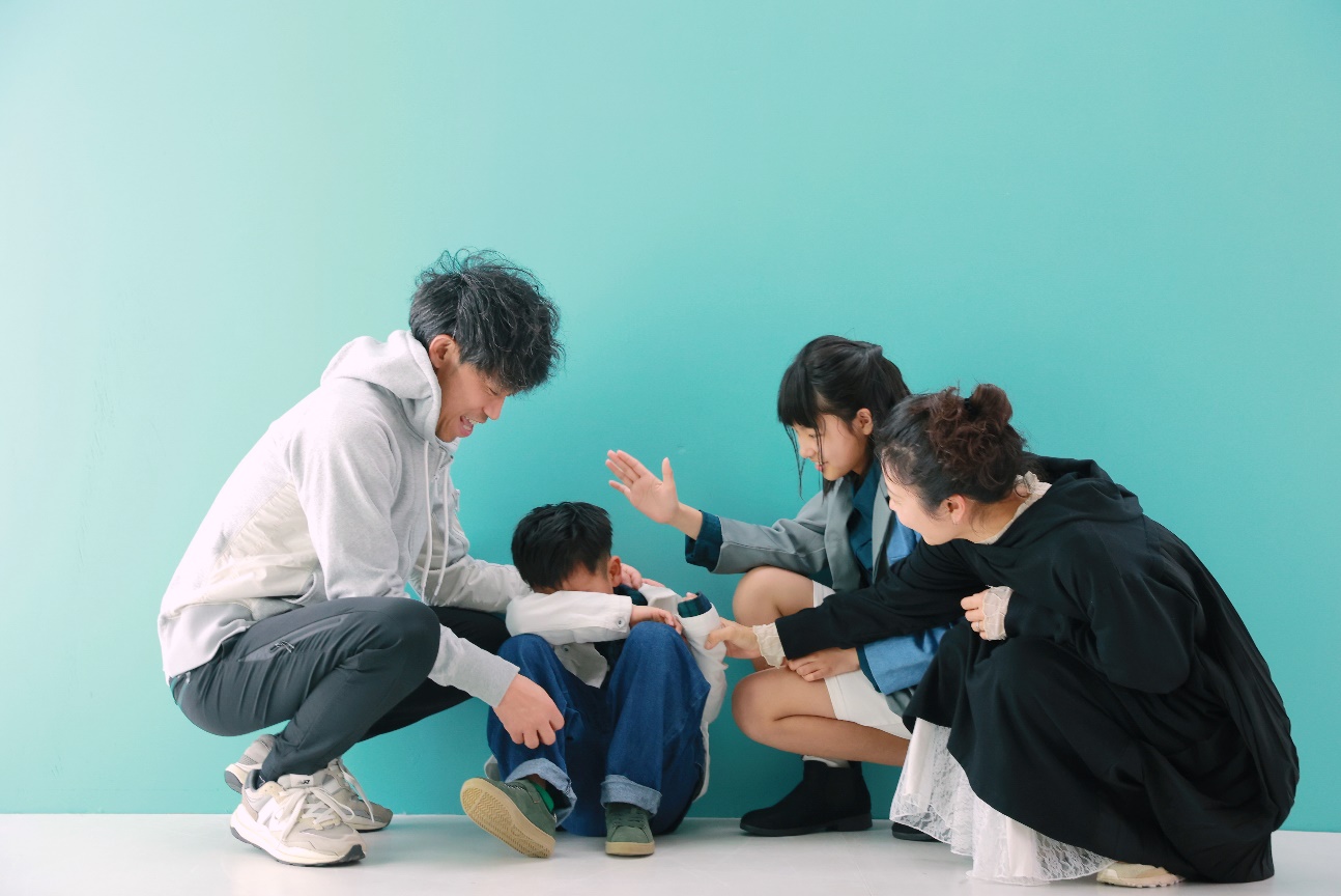 ご家族写真の撮影時に「家族の中でお寝坊さんは誰ー?」の声かけの答えが「あさひー!」だった瞬間…しゃがみ込んでお顔を隠してしまったあさひくん。