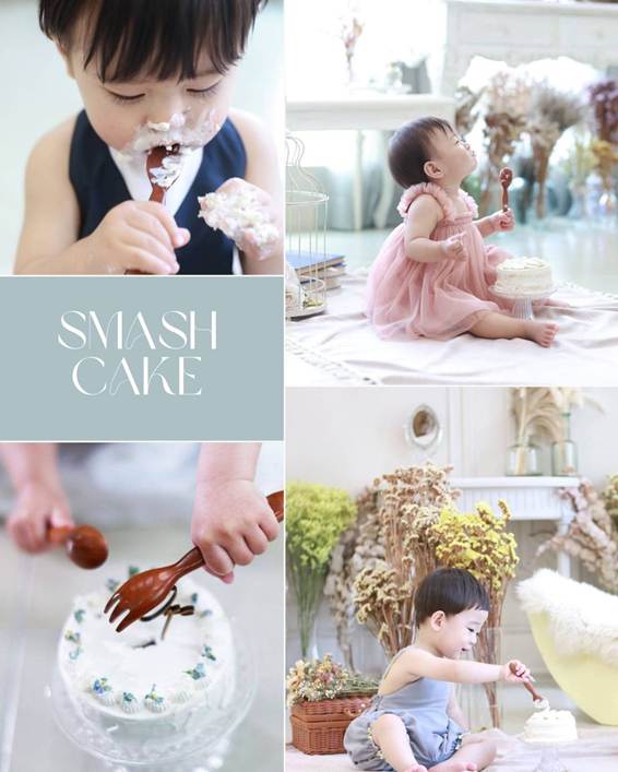 ケーキをダイナミックに手づかみ食べする姿が、赤ちゃんらしくて可愛い!1歳ならではなイベントをぜひやりたい!と大評判のスマッシュケーキ撮影!