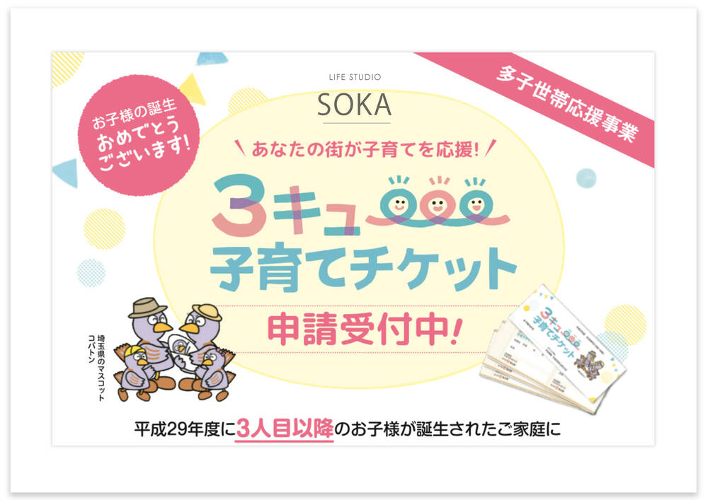 「3キュー子育てチケット」というものが埼玉にはあるのをご存知でしょうか?「3キュー子育てチケット」とは埼玉県が実施する平成29年4月1日以降に三人目の子どもが生まれたご家族に第三子以降が生まれた家族がもらえる、子育て支援サービス等に利用できるチケットです!そして「3キュー子育てチケット」をライフスタジオ草加店でもご利用頂けるようになりましたのでご紹介します!誕生日の記念、七五三、入園入学などなどライフスタジオで草加店でご家族様の記念写真を残す際にぜひ活用しましょう^^