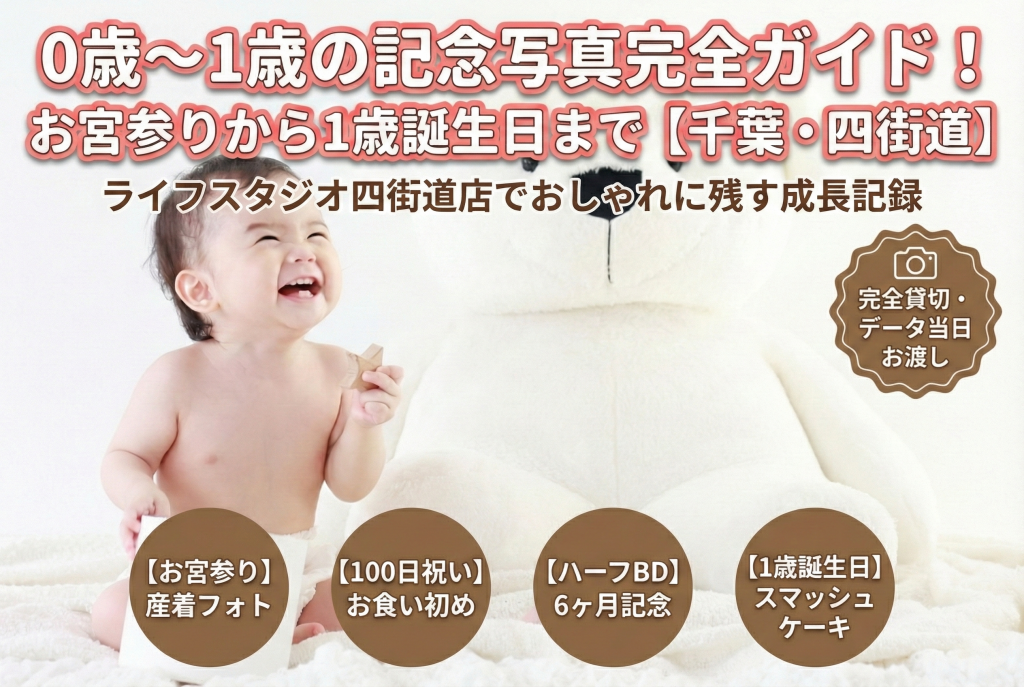 赤ちゃんがあっという間に成長する0歳から1歳。お宮参り、100日祝い、ハーフバースデー、そして1歳記念。千葉・四街道エリアのパパママへ、撮り逃したくない記念写真のベストタイミングと、赤ちゃん連れでも安心な貸切スタジオの魅力をご紹介します。