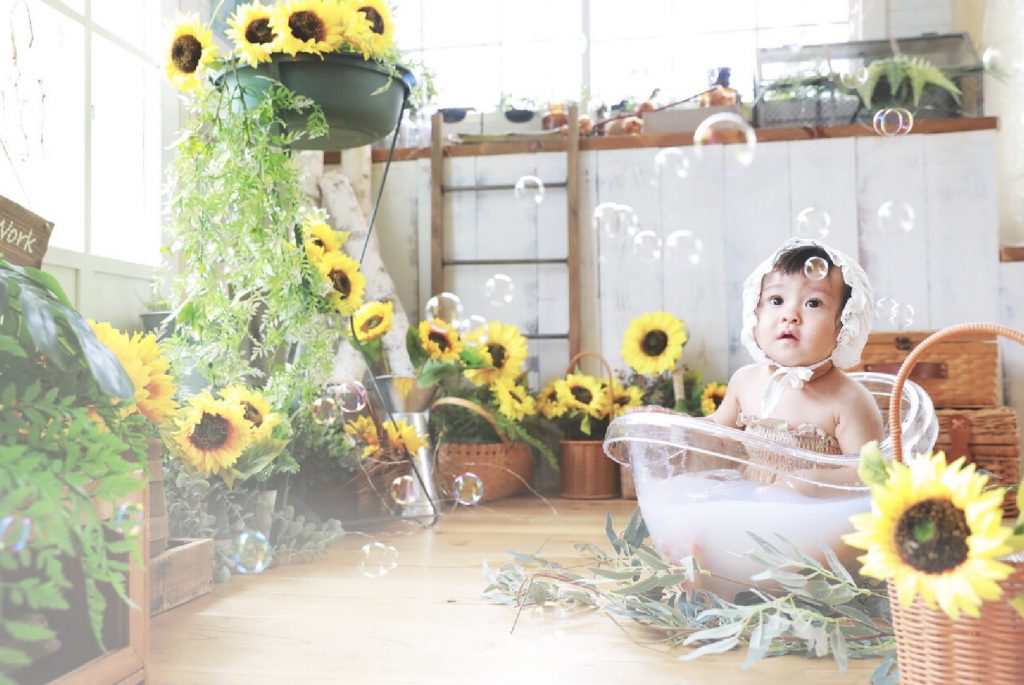 💭 1歳記念・H様 普段はお風呂でバシャバシャ遊ぶのが大好きなので、ミルクバスを選びました!予想通り、お湯に入った瞬間に満面の笑み。スタジオのセットやお花もセンスが良くて、本当に絵本の中にいるみたいで可愛かったです。