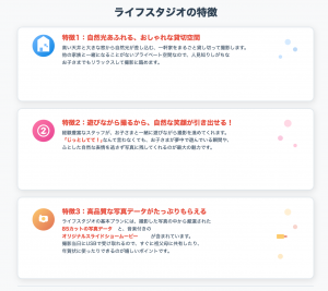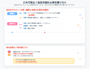 • 親切なスタッフ: カメラマンやアシスタントが子どもの扱いに慣れているので、人見知りするお子さまでも安心です。ポーズの提案や小物のアレンジなど柔軟に対応してくれます。