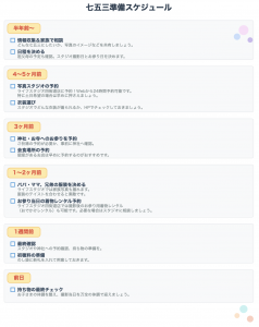 七五三当日は神社でのご祈祷や親族との会食など慌ただしくなりがちです。前撮りをしておく場合も、当日の段取りを確認しておくと安心です。