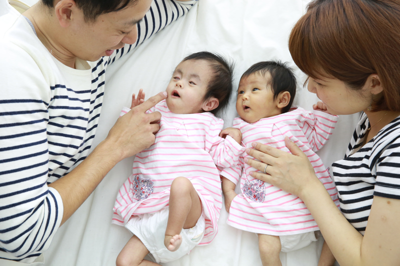 みゆちゃんの身体の大きさはきほちゃんと同じくらいで、2人はパパとママにそれぞれ抱っこされてお店に入ってきました。