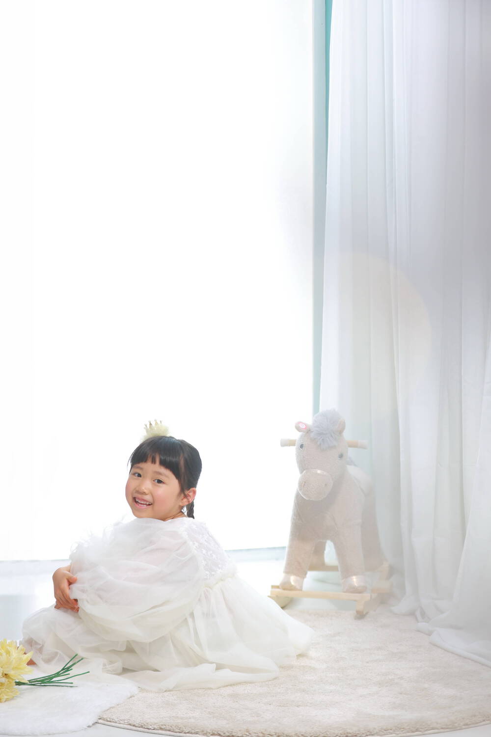構図はドレスの広がりと木馬により三角構図を作り、画面に安定感を出すことを意識しました。