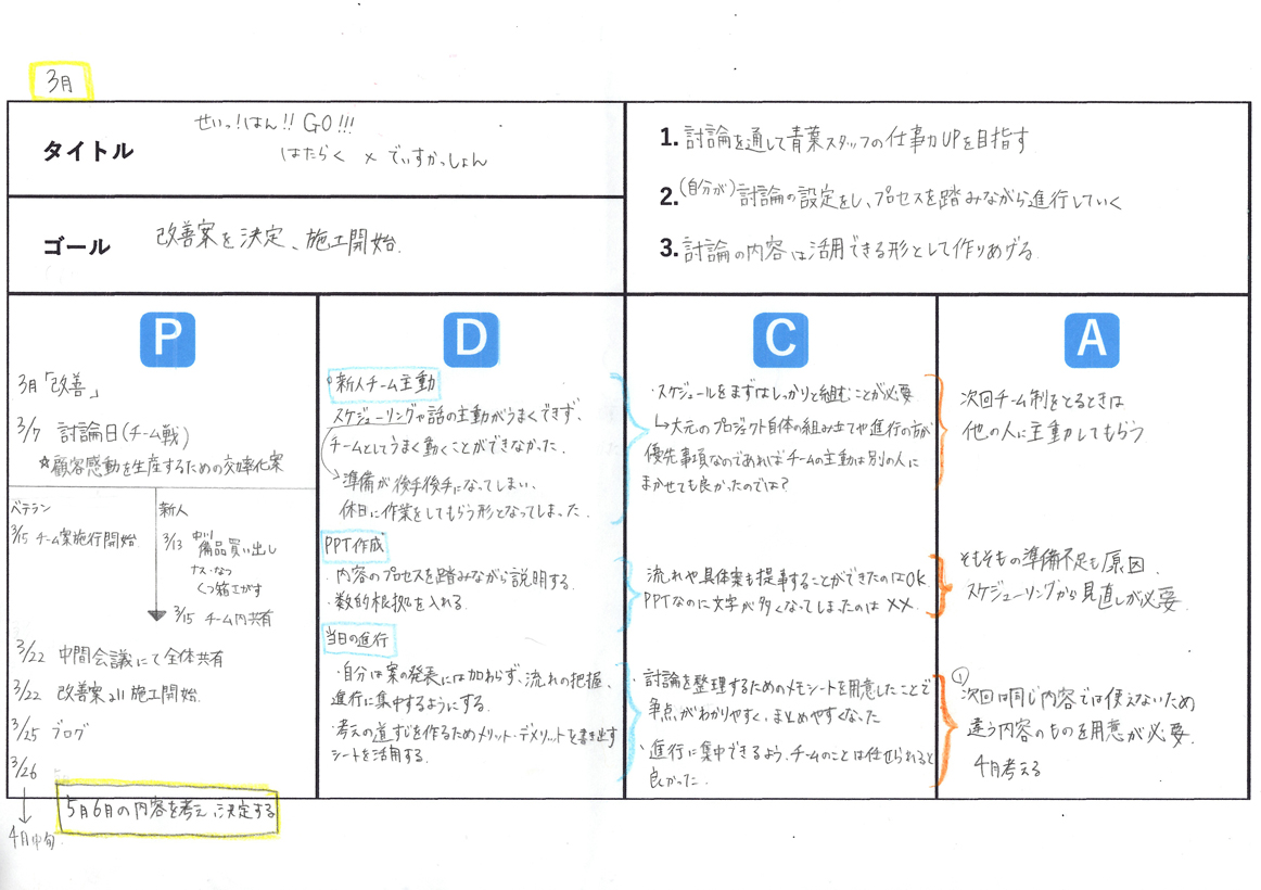 青葉店では現在PDCAノートを活用しながら様々な運営を行っているため、3月の内容と反省点はノートに記入。