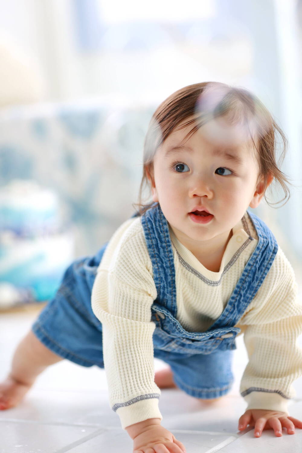 すると、大好きなシャボン玉を見上げながら、カメラの方へハイハイをしてきてくれました。