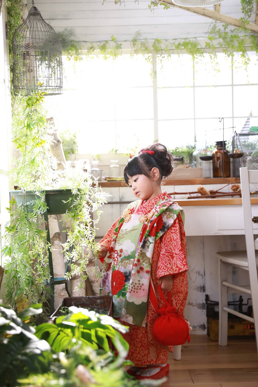 着ているお着物もそんな彼女にぴったりな赤色と緑色。